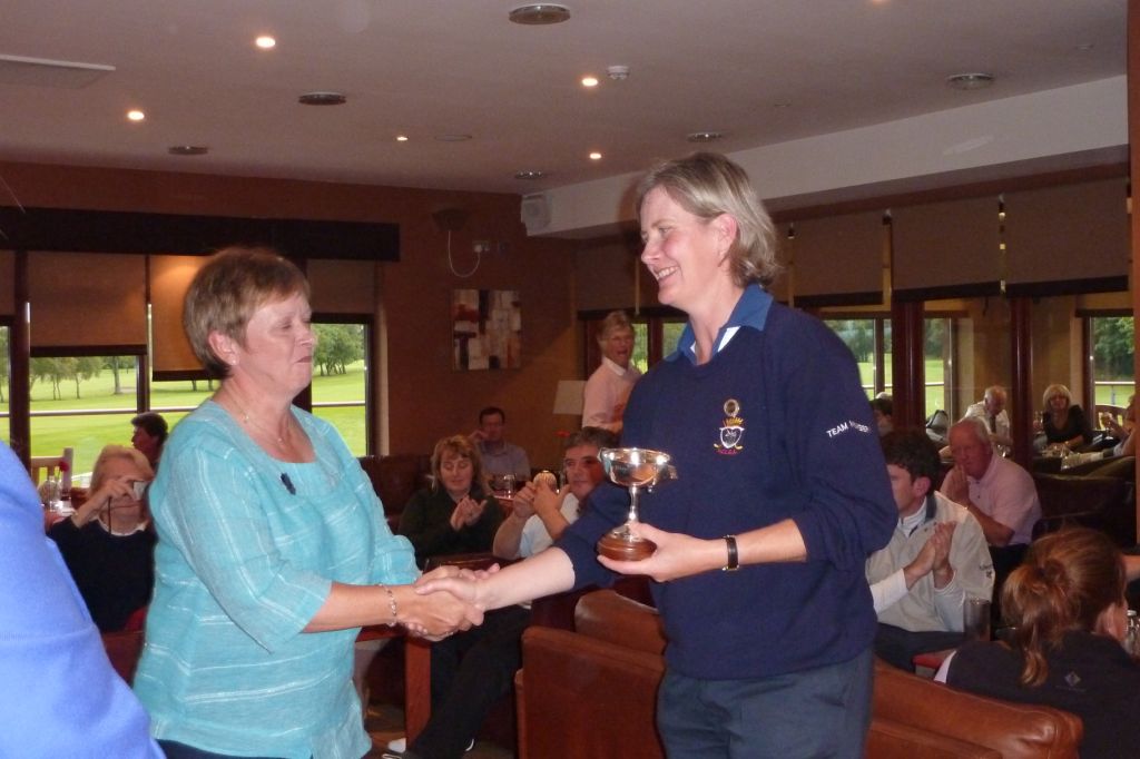 For some reason we barely had time for lunch before the afternoon singles were being called to the first tee. We had to win all of the afternoon singles. In our heart of hearts, we knew it was a lot to ask and so were out to do our best so as we could hold out heads up at the end of the weekend. We changed our order, putting Rachael out first and Jane out last. Unfortunately, so did Angus! We then had Gabrielle, moved Karen up to number 3, Kate and Louise Fraser. All were under strict instructions to win. It didn’t matter by how many, they just had to win. By the 7th hole, we had more or less resigned ourselves to the fact that we were not going to do it. We were 3 down in the first, third and sixth matches. Gabrielle and Kate were all square, while Louise was 4 up – it wasn’t going to be enough. Suddenly, news filtered through that Renfrewshire were only up in one of their games. That brought us hope and gave us renewed vigour to spur on the team. Suddenly, the fightback began. Rachael got her match back to all square, Karen was back to 1 down, Jane was back to all square, Gabrielle and Kate were all square and Louise was 5 up. Then results of the other match started to come through – a half in the first game (hope was building), a win in the second game to Renfrewshire (we could cope with that but it was going to be tight), a loss in the third (we wanted to hear more of that kind of news), but then a win in the fourth, loss in the fifth and win in the sixth made us get our thinking caps on. Renfrewshire had won by 5.5-3.5 which meant we needed all 6 of our games. Suddenly, Rachael was 1 up on the 18th. She boomed an almighty drive straight down the fairway and hit a peach of a 5 iron on to the back of the green – a 432 yard hole! Two putts and the game was hers. Next followed Gabrielle, also 1 up on the 18th. A great drive and a sensible lay up was followed by a lovely approach to the green and 2 putts for a regulation par, a halved hole and her game. Meanwhile, news came from the course that Louise had won her game by a marvellous 7&5 margin and Kate was dormie 2 up, eventually winning by 2&1. Things were beginning to happen and excitement was building! Were we going to do it? Were we going to upset the odds with a fantastic last afternoon performance? Unfortunately, Karen arrived on the 18th tee 1 down, and the dreams were over. But having said that, she hit a fabulous drive before nearing the spectators to ask the state of the match. It certainly was far from easy to tell her that it was over. There was nothing we could do to force a further countback. But, to give Karen credit, she played the 18th under extreme disappointment, stuffing a wedge to a couple of feet and sinking the putt for a birdie and a halved game. As the cheers from Renfrewshire began to resound around the course, Jane finished her match, after a tremendous comeback, at the 16th, winning by a 3&2 margin.